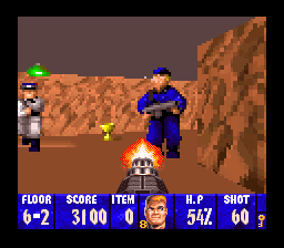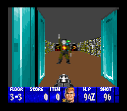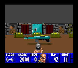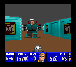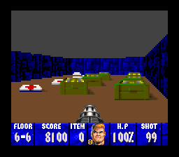 Vous incarnez William Blazkowicz's, alias “B.J.” (sans doute un surnom qu'on lui donnait à l'armée depuis qu'il s'est illustré dans les douches après un malheureux pari raté, allez savoir), un espion capturé et jeté dans les geôles bleu-schtroumpf de la forteresse de Wolfenstein et qui, à la force de ses gros bras et de ses aptitudes au lynchage de nazis finira par mettre fin au régime du IIIème Reich à lui tout seul. Ou du moins, ce sont là des exploits que vous n'hésiterez pas à vous approprier, en joueur aguerri et hypocrite que vous êtes. Laissez-moi vous dire que si nous autres joueurs avions été à la places des français en 40, on se serait bien mieux défendus au lieu d'aller cafter tous les Lévy du boulevard. Mais l'histoire est immuable, les nazis ont déployé la fanfare et les feux d'artifice en défilant sur NOS Champs-Élysée et il nous aura fallu attendre 1994 avant que Wolfenstein 3D ne soit porté sur Super Nintendo, et c'est la version qui nous intéresse aujourd'hui, même si c'est vraiment un prétexte pour parler de ce jeu fabuleux amputé ici de son pied d'appel mais nous y reviendrons plus tard.