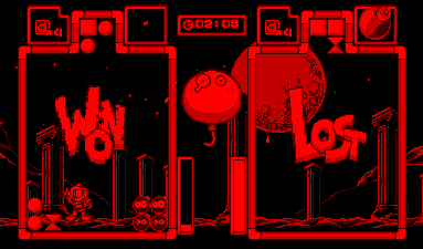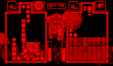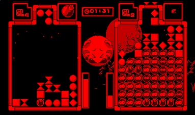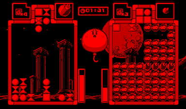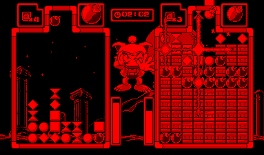 On aligne donc ses petits motifs dans des bouteilles façon Docteur Mario. Au bout de 3 alignements minimum, pouf elles disparaissent, faisant apparaître une bombe sur votre écran. Cette bombe pourra exploser avec les nombreux bonus que vous recevrez tout au long du ‘combat'. Les bonus sont aussi variés que les genoux de ma grand-mère… Ah, on me fait signe dans l'oreillette qu'ils sont avariés… Passons. Les bonus arrivent de manière aléatoire, et sont très variés. On va de la grosse bombe qui explose la moitié de l'écran, à l'inversion des boutons et des directions, au bloc qui tombe sans possibilité de mouvement… Du bonheur.