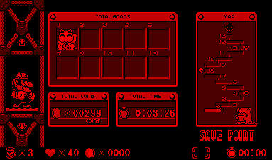 On baroude peinard le long des 14 niveaux, qui s'enchainent géographiquement, mettant de côté le système des cartes des autres Warioland. Ici, si on veut revenir en arrière, il va falloir se retaper tous les niveaux en sens inverse. Alors c'est un peu dérangeant au départ, mais on s'y fait vite, et on change de méthodologie. Là où sur Game Boy on torchait tout le jeu en revenant dans les niveaux un par un à la cool, on préfèrera l'acharnement dès le premier coup. Bah oui, c'est très pénible d'arriver à l'avant dernier niveau et de devoir se refaire tout le jeu à l'envers pour récupérer ce trésor de merde qui nous a échappé un soir de beuverie.