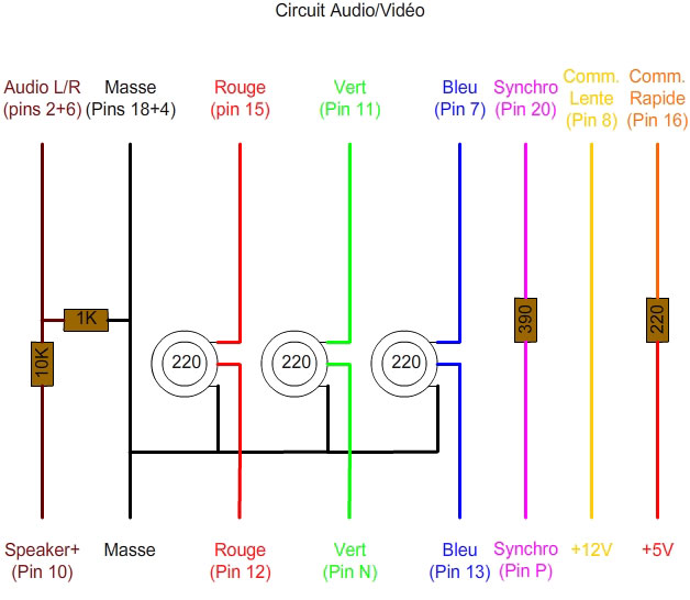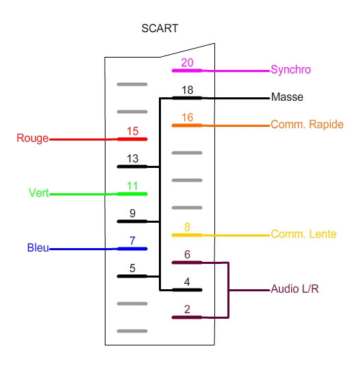 Si vous avez suivi le début de ce chapitre, ça devrait s'expliquer tout seul. On y voit les quatre canaux vidéo (R, G, B, Sync), le canal audio branché sur les deux pattes stéréo, la comm. lente et la comm. rapide, et enfin les masses. La seule masse indispensable est celle de la patte 18, mais bon, par sécurité, il vaut mieux aussi câbler les masses des canaux RGB et de l'audio.