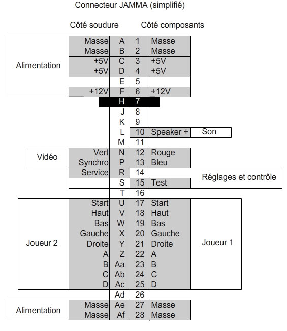 Voici le plan du connecteur JAMMA simplifié au maximum pour nos besoins. Seules les parties à câbler sont représentées. J'ai volontairement omis tout ce qui était monnayeurs et compagnie, avantageusement remplacés par le bouton Service. Si vous disposez d'un connecteur précâblé, virez tout ce qui ne servira à rien, ça permet d'y voir un peu plus clair. La pin 7/h est un détrompeur, si vous jetez un oeil sur une PCB vous verrez un trou à la place. C'est conçu pour empêcher l'insertion dans le mauvais sens du connecteur, qui pourrait avoir des effets désastreux. S'il n'y a pas de bitoniau en plastique à la place de la pin 7, marquez-la comme vous pouvez (gomette, marqueur, blanco, poupée vaudou...).