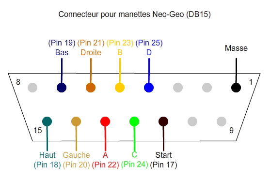 Si vous comptez construire également les manettes ou que vous n'avez pas de manettes Neo-Geo sous la main, vous pouvez vous passer des connecteurs DB15. Je vous renvoie à un