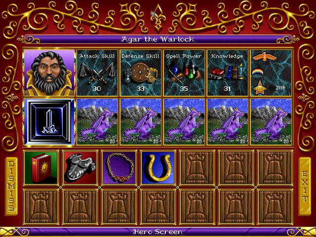 4 châteaux, 4 classes de héros, 24 types de créatures, 7 ressources, des mines, des voyages en bateau, le risque de perdre définitivement son héros s'il meurt (soyez courageux, pensez à la fuite ! (ou mieux, à l'abandon rémunéré)), des dizaines de sorts différents, bref des centaines de raison pour qu'HOMM soit un carton absolu.