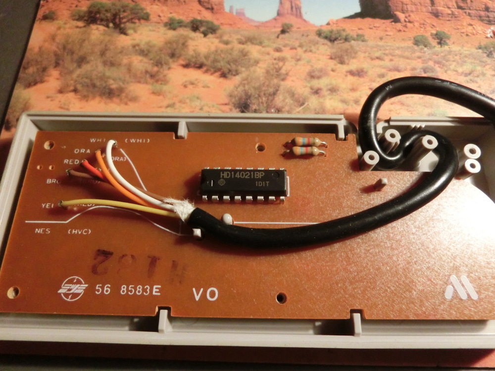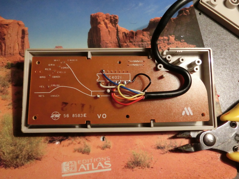 Démontons maintenant notre manette NES. Que découvrons-nous et qu'il n'y a pas sur celle de la Master System ? Exactement, un petit circuit intégré et deux résistances.