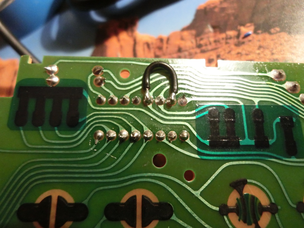 En connectant le pin nr5 en partant d'en haut à gauche avec le nr7 nous venons d'assigner à A et Start la même fonction. Vous pouvez donc sauter ou frapper avec Start dans certain jeux ce qui est, vous en conviendrez, hilarant.