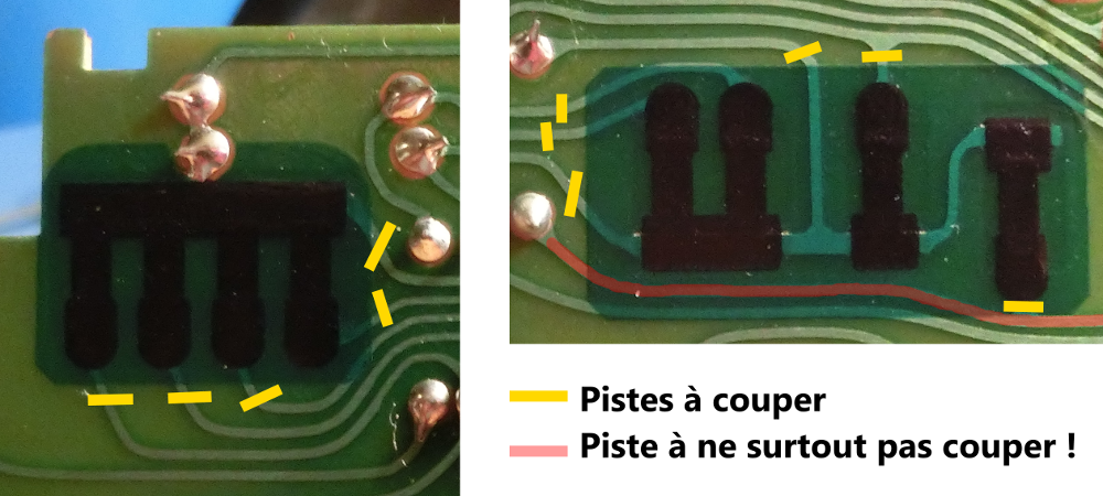 Il nous reste à couper les pistes qui vont vers les résistances intégrées au circuit. Faites bien attention de ne pas couper une autre piste. Un zoom sur la PCB va nous permettre de regarder en détail les lieux de découpe.